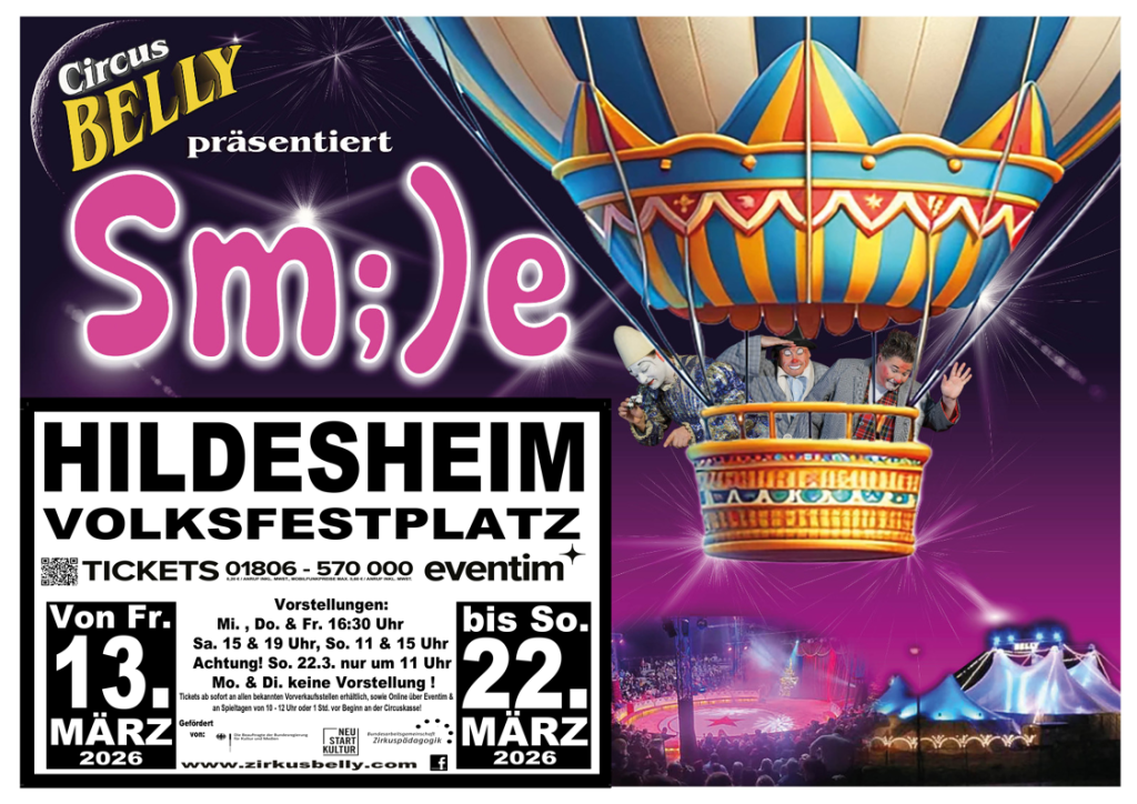 Circus Belly, unter der Leitung von Direktor Klaus Köhler, ist ab 13. März 2026 wieder auf Tournee. Mit viel Clownerie, atemberaubender Akrobatik in luftigen Höhen, Tierdressuren und jeder Menge Magie entführt die neue Show „Smile“ ihr Publikum für ein paar glückliche Stunden in die zauberhafte Zirkuswelt.
