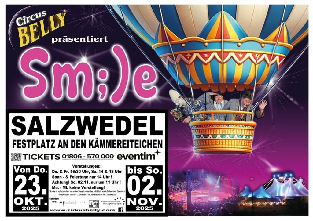 Ab dem 6. März ist Circus Belly wieder mit Smile auf Tournee. Saisonauftakt nach der Winterpause ist vom 6. bis 16. März in Langenhagen. Von dort aus geht es weiter quer durch den Heidekreis in Richtung Hamburg. Und so viel sei schon jetzt verraten: im Herbst reist der Circus dann von Salzwedel aus endlich mal wieder in Richtung Osten.